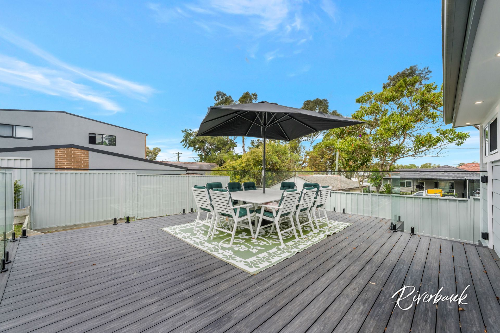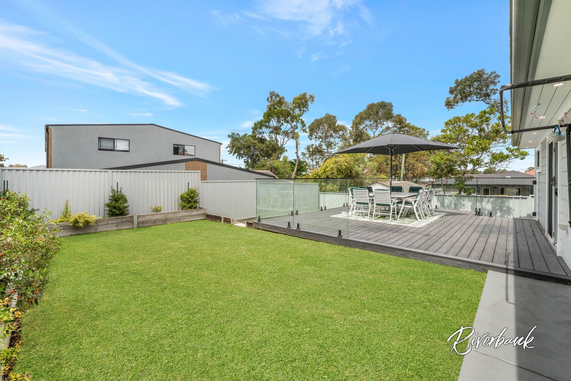 Decked outdoor area with manicured back yard